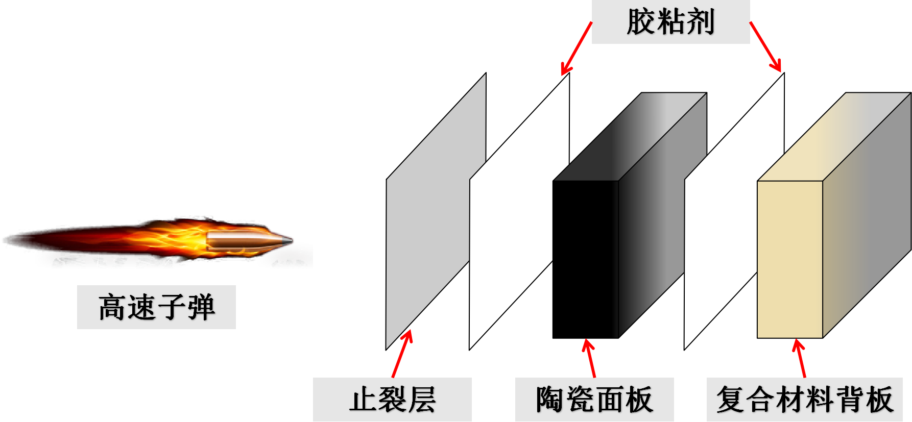 大多數(shù)復(fù)合陶瓷裝甲都是采用結(jié)構(gòu)陶瓷靶面+金屬/非金屬背靶結(jié)構(gòu),如下圖所示