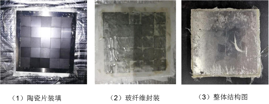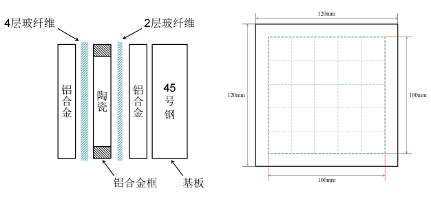 靶板從左到右依次為鋁合金面板、4層玻纖布、鋁合金邊框及陶瓷片、2層玻纖布、鋁合金背板、45號鋼基板。采用鋁合金邊框?qū)μ沾蓧K進行二維約束,再將玻纖布平鋪在陶瓷層的正面和背面(正面鋪上四層玻纖布、背面鋪上兩層玻纖布),正面與背面再用鋁合金板密封,使用聚氨酯膠黏劑將整個結(jié)構(gòu)在常溫下固化成型為復合裝甲陶瓷結(jié)構(gòu)件。