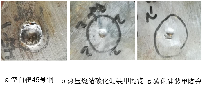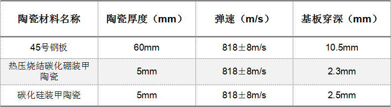 測試中,采用空白靶最對比,85式7.62毫米狙擊步槍對45號鋼的垂直侵徹深度為10.5mm,以此作為陶瓷復合裝甲的抗彈性能評判標準。對熱壓碳化硼裝甲片、碳化硅裝甲片進行抗彈性能進行評估。