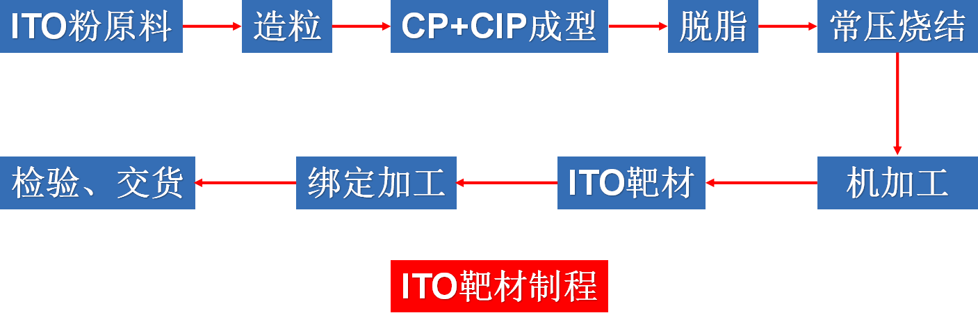 其專利高純高密度ITO靶材的制備方法:將自制的ITO粉加純水配制成漿料,之后加入分散劑,在砂磨機(jī)中砂磨,之后加入粘結(jié)劑和消泡劑進(jìn)行球磨,再經(jīng)噴霧造粒得到ITO造粒粉;將得到的ITO造粒粉裝入模具中預(yù)壓成型得到ITO初坯;將得到的ITO初坯在冷等靜壓機(jī)上成型得到ITO素坯;將得到的ITO素坯在脫脂爐中脫脂,之后再在通氧氣氛的燒結(jié)爐中燒結(jié),即得到高純高密度的ITO靶材。