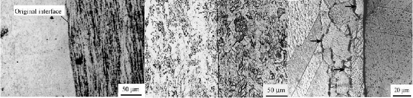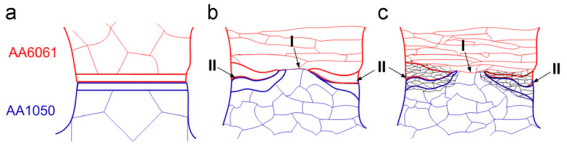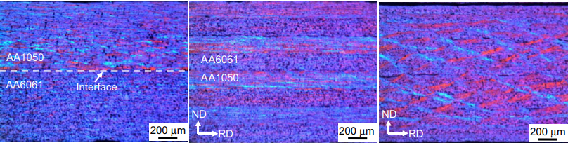 而su[2]等學者研究發(fā)現(xiàn)退火處理后的AA1050/AA6061板材經(jīng)過累積軋制的超細晶多層復合材料在不同道次下界面會呈現(xiàn)不同特征,初始三個道次內(nèi),不同鋁合金母材基本上能夠同步協(xié)調(diào)變形,但是當軋制次數(shù)變多時,AA6061界面就會發(fā)生頸縮,斷裂,最終發(fā)生界面紊亂。